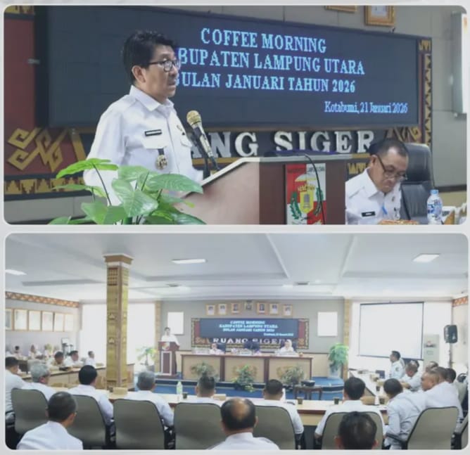 Bupati Lampung Utara Dr. Ir. Hamartoni Ahadis, M.Si bersama Wakil Bupati Romli, S.Kom., S.H., M.H. memimpin kegiatan coffee morning Pemerintah Kabupaten Lampung Utara bulan Januari Tahun 2026 di Aula Siger Setdakab. Lampung Utara, Selasa 21 Januari 2026. Kegiatan turut didampingi Pj. Sekda Dra. Dina Prawita Rini, M.M. sebagai bentuk konsolidasi awal Tahun dalam memperkuat koordinasi pelayanan publik.