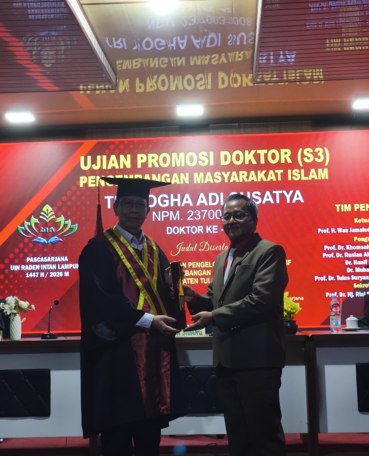 Tri Yogha Adi Susatya, Kabag Organisasi Setdakab Tulang Bawang berhasil meraih gelar doktor Ilmu Pengembangan Masyarakat Islam pada Pasca Sarjana Universitas Islam Negeri Raden Intan Lampung. Disertasinya berjudul “Analisis Kemitraan Pengelolaan Zakat Produktif Dalam Pengembangan Masyarakat Islam di Kabupaten Tulang Bawang” sukses dipertahankan pada sidang promosi doktor di Ruang Sidang Pasca Sarjana Universitas Islam Negeri Raden Intan Lampung pada senin, 20 April 2065, dengan nilai IPK 3,87 dan predikat summa cumlaude.